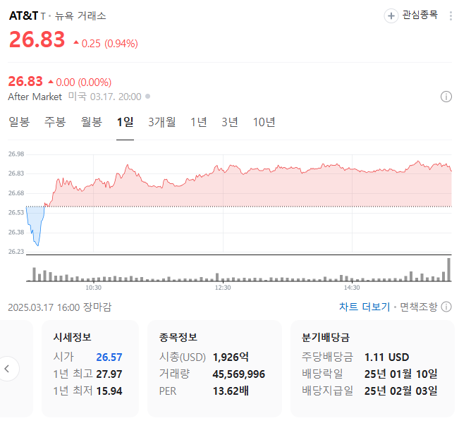 - 특징: AT&T는 미국의 주요 통신사로, 무선 및 유선 통신 서비스를 제공합니다. 최근 미디어 사업 부문의 재편을 통해 핵심 사업에 집중하고 있으며, 안정적인 배당을 유지하고 있습니다.