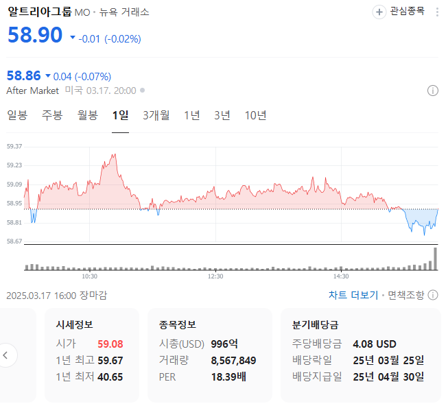 - 특징: 알트리아 그룹은 미국의 대표적인 담배 제조사로, 말보로(Marlboro) 브랜드로 유명합니다. 오랜 기간 동안 안정적인 현금 흐름을 유지하며, 고배당 정책을 이어오고 있습니다. 그러나 담배 산업의 특성상 규제와 소비 감소 등의 리스크를 고려해야 합니다.