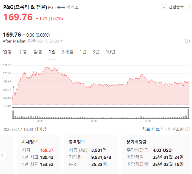 - 특징: P&G는 생활용품 분야의 선도 기업으로, 기저귀, 세제, 화장품 등 필수 소비재 시장에서 높은 점유율을 유지하고 있습니다. 안정적인 현금 흐름을 기반으로 지속적인 배당 인상이 기대됩니다.