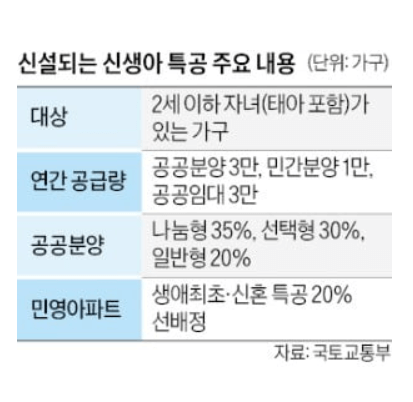 공공 분양(뉴홈) : 소득 조건으로 월평균 소득 150% 이하, 자산 3.97억 이하여야 하며, 기존의 신혼부부 특공과는 별개입니다. 비중은 시세의 70% 이하 가격으로 분양하는 나눔형(35%)이 있고, 저렴한 임대료로 거주하다가 6년 뒤 분양 여부를 선택할 수 있는 선택형(30%)이 있습니다. 국토교통부는 공공분양 정보 누리집인 '뉴홈'에 신생아 특공을 신설하고 연간 3만 호 주택을 공급할 예정입니다.
