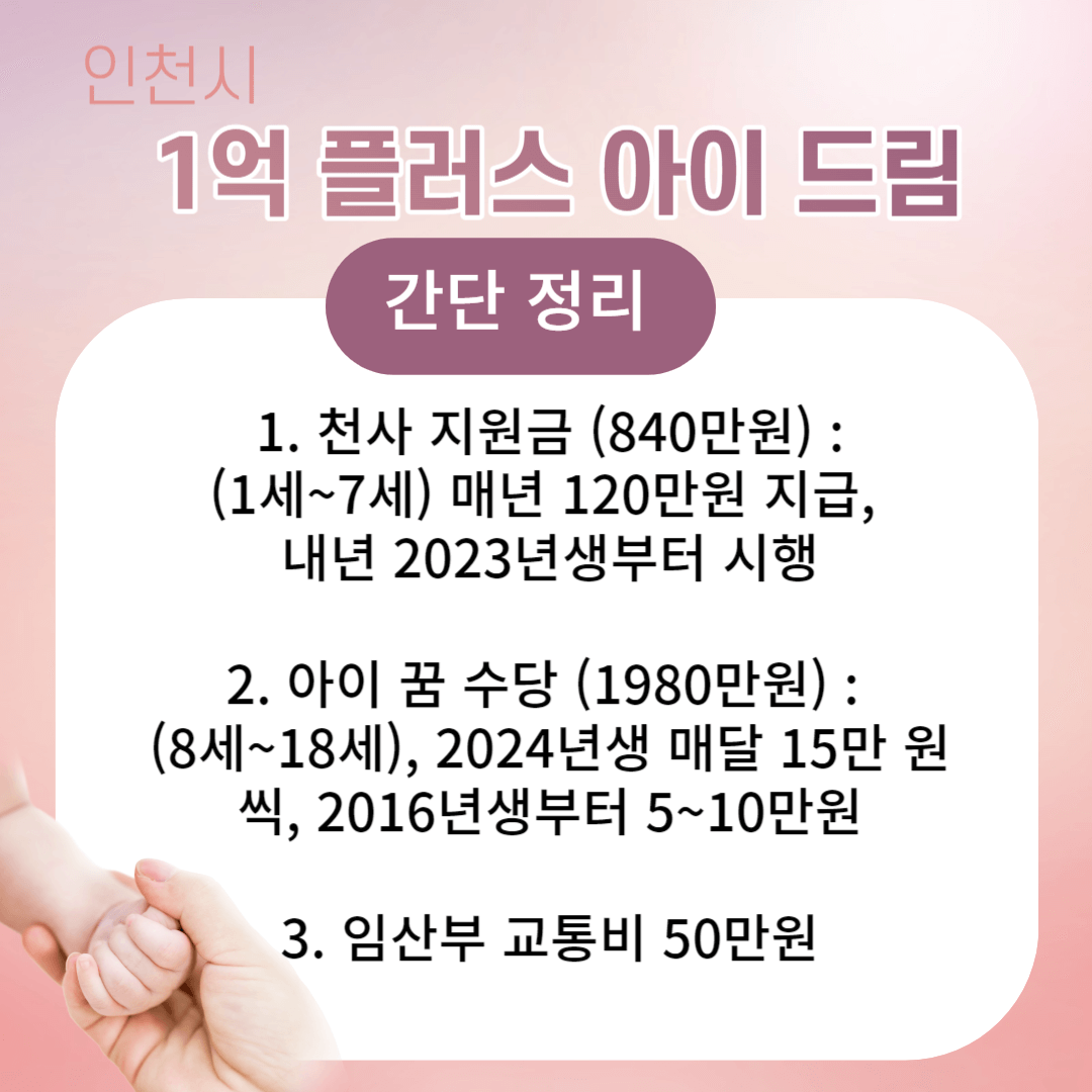 인천광역시가 12월 18일 인천시에서 태어나는 모든 아이에게 1억 원을 지원하는 출생 대책의 일환인 '1억 플러스 아이 드림' 을 발표했습니다. 이번 사업은 부모 급여, 자녀 수당, 교육비 지원은 물론, 임신과 육아에 대한 전반적인 경험을 향상시키기 위한 노력으로 보입니다. 현재 인천시는 초·중·고교에 걸쳐 첫만남 이용권(200만원), 부모급여(1800만원)와 아동수당(960만원), 보육료 및 급식비(2540만원), 교육비(1650만원) 등으로 7200만원을 배정하고 있습니다.