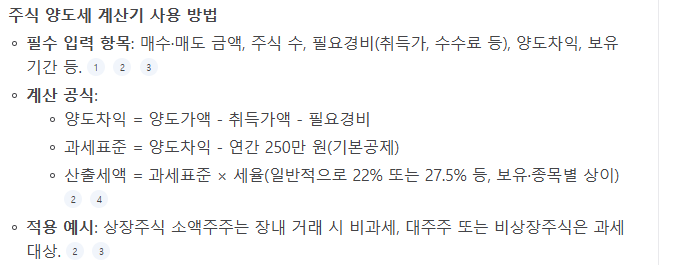 주식 투자자라면 매매차익에 대한 양도소득세를 미리 확인하는 것이 중요합니다. 온라인 계산기를 사용하지 않아도, 계산 방법과 예시를 알면 충분히 예측할 수 있습니다.