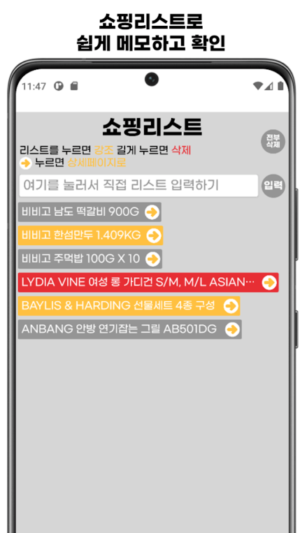 3. 쇼핑리스트 메모장 기능도 있고, 관심상품도 담아둘 수 있고 불필요한 상품은 간편하게 삭제할 수 있습니다.