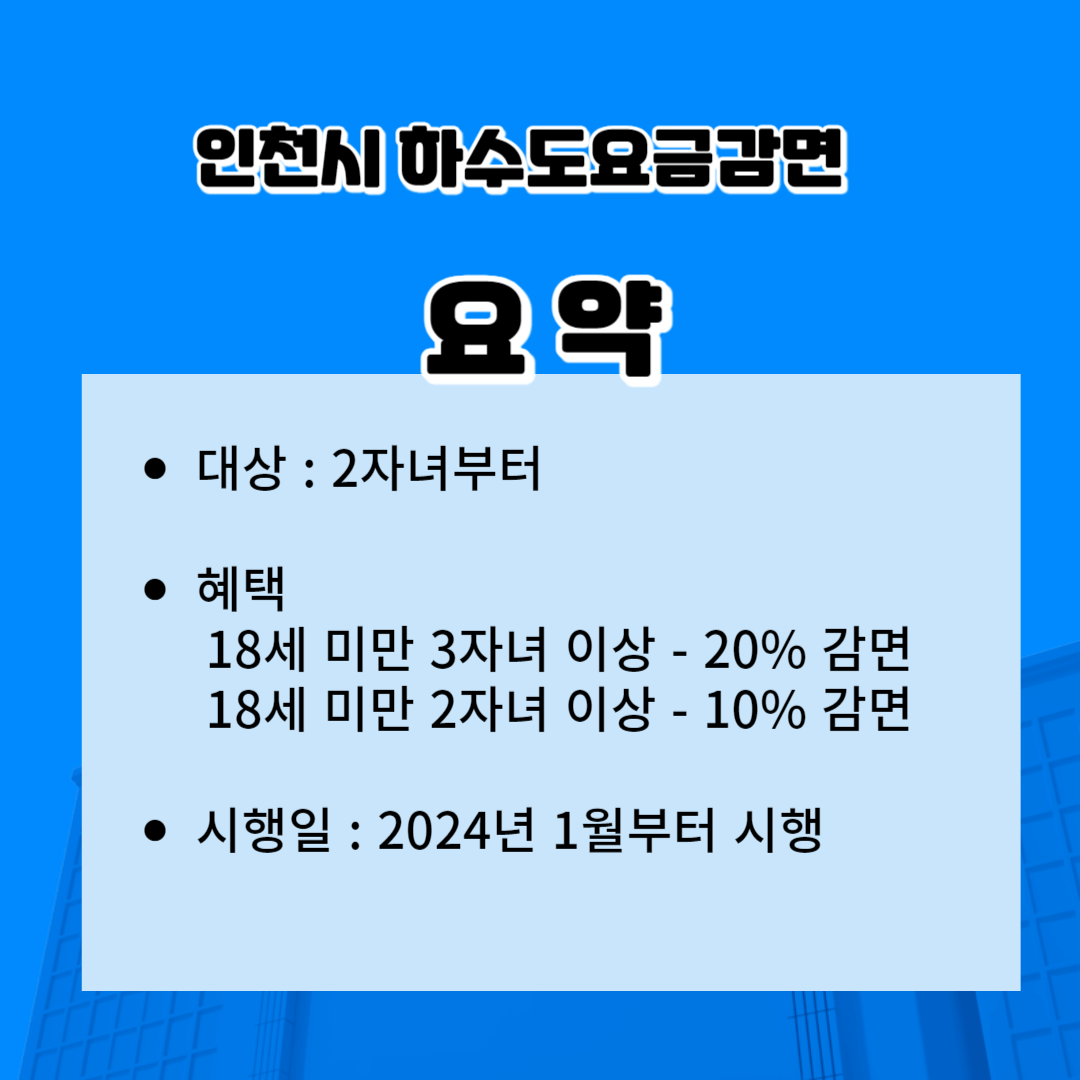 인천시는 다자녀 가정에 대한 경제적 지원을 위해 하수도 요금 감면혜택을 확대하여 2024년 1월부터 시행할 예정입니다. 이는 출산율 저하에 따른 정책의 일환으로 2자녀부터 감면대상을 확대하여 혜택을 주려는 것으로 보입니다. 저출산 대책으로 나온 방안이지만, 많은 예산이 들어가는 만큼 효과를 볼 수 있을지에 대해 지적이 나오기도 합니다. 하지만 대상이 된다면 신청하셔서 혜택을 보시길 바랍니다