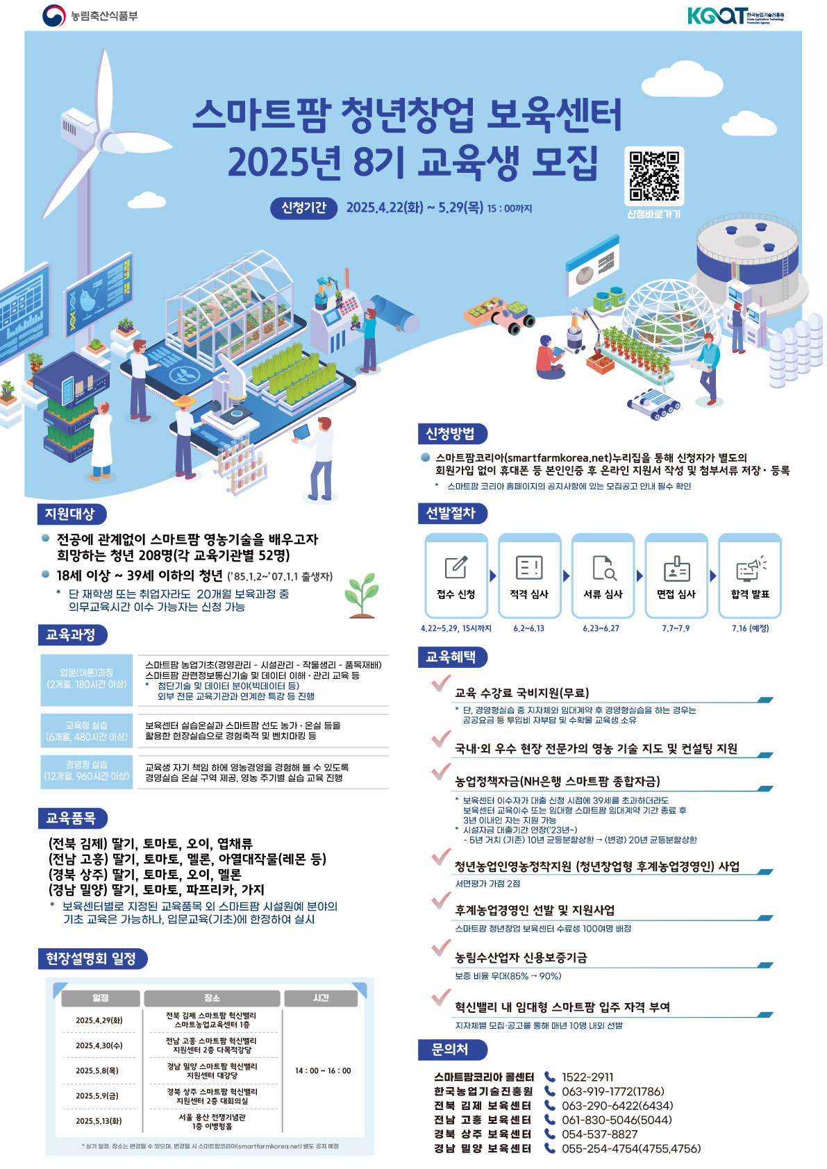 - 스마트팜 청년창업 보육센터: 1년간 교육·실습 지원, 숙식 제공 포함