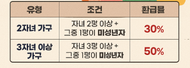 | 2자녀 가구 | 자녀 2명 이상 + 그중 1명이 미성년자(만 18세 이하) | 30% |