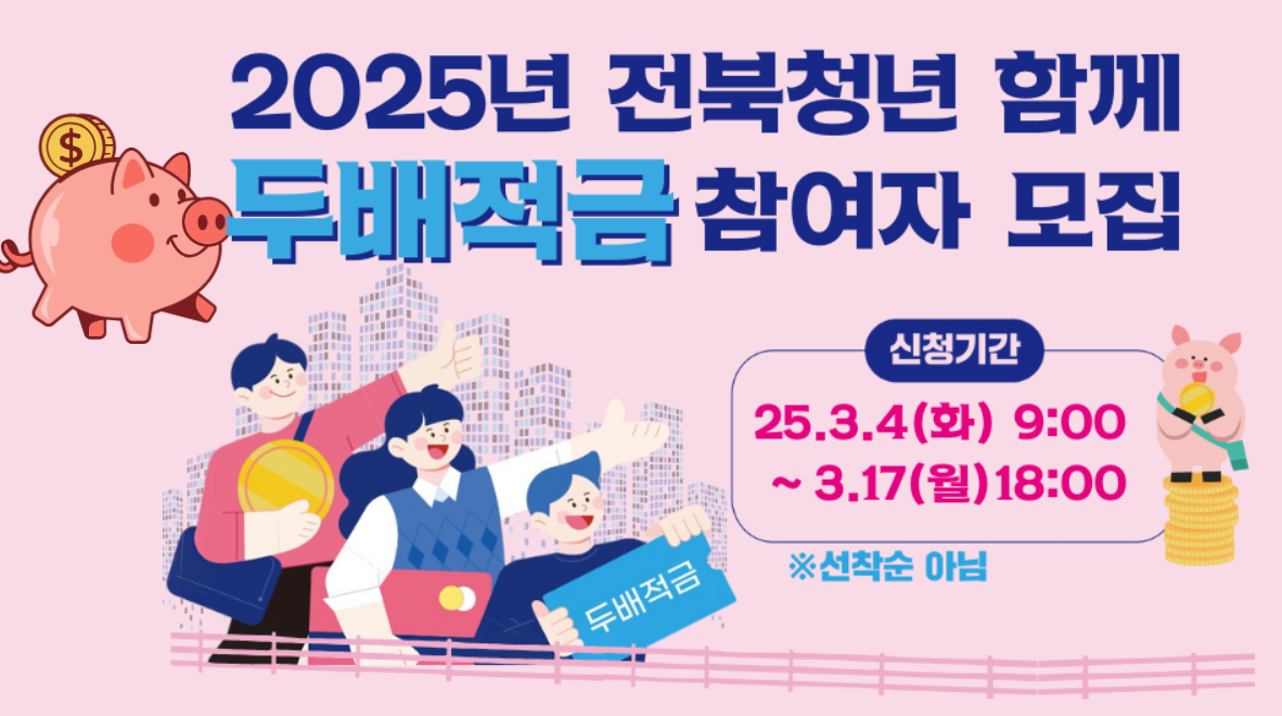 지원 자격은 공고일 기준 전라북도에 거주하는 만 18세부터 39세 사이의 근로 청년으로, 중위소득 140% 이하인 경우에 해당합니다. 신청은 3월 17일 오후 6시까지 '두배 적금 플랫폼'을 통해 가능합니다.
