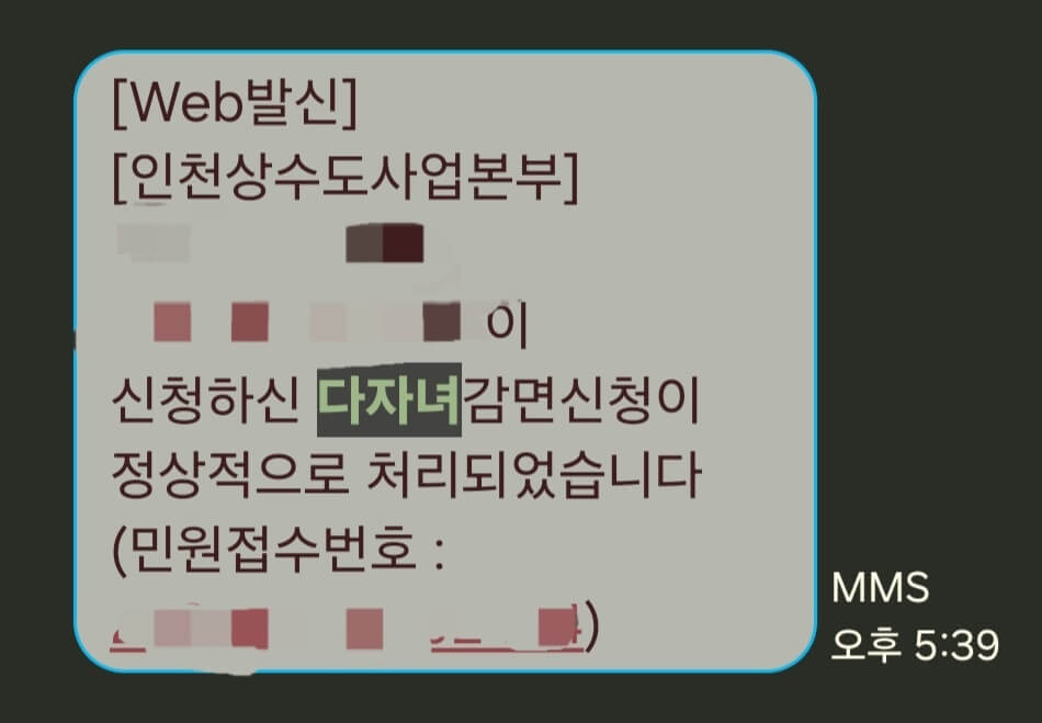 (비회원신청자는 상세내역을 볼 수 없다고 합니다. 뭐 신청만 되면 되기 때문에..) 정부 24 가서 주민등록등본 신청해서 pdf로 프린트하고, 수용가와의 관계가 뭔지 몰라서 헤매다가 관리실에 전화해서 상하수도 정보를 알아두었습니다. 신청서도 프린트해서 서명해서, 스캔한 후 pdf로 만들고.... 간단한데 의외로 잡일이 많았습니다; 그래도 온라인으로 신청할 수 있다니 간편해져서 좋았습니다. 우리 집에서는 행정복지센터 가려면 어쨌든 일 이거든요;;; 신청하고 나면 이렇게 문자가 온답니다. 할인이 되었는지는 다음달에 잘 확인해봐야겠네요