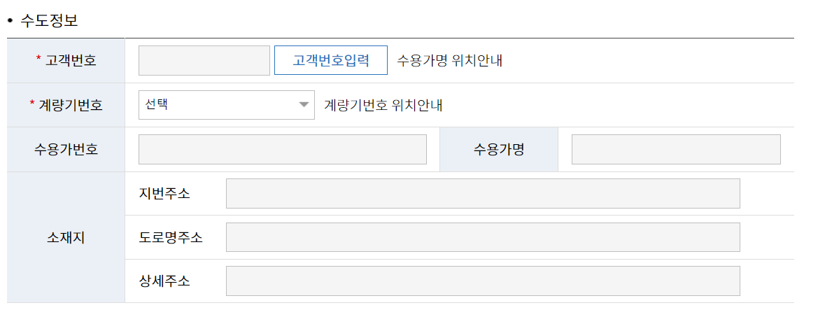 1. 고객번호, 수용가명 확인 후 작성 바랍니다(아파트 등 공동주택의 경우 해당 관리사무소에 문의)