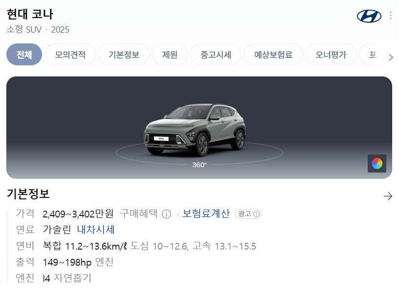 - 코나 가솔린: 전장 4,350mm / 1.6 가솔린 / 복합 13.6km/L