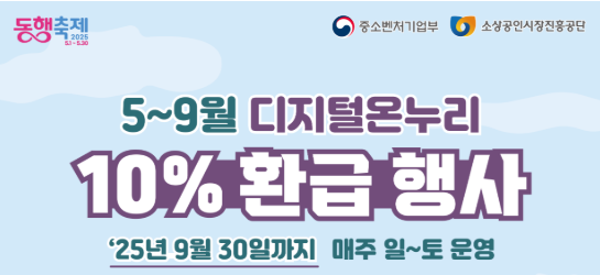 중소벤처기업부와 소상공인시장진흥공단이 주관하는 디지털 온누리 10% 환급행사가 돌아왔습니다. 2025년 5월 11일부터 9월 30일까지, 매주 일~토요일마다 참여할 수 있는 이 이벤트는 구매할인 + 환급혜택을 동시에 누릴 수 있어 더욱 알뜰한 소비가 가능합니다.