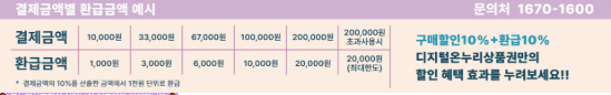 디지털 온누리상품권을 사용한 누적 결제 금액에 따라 최대 10% 금액을 환급해주는 제도입니다. 앱을 통해 디지털상품권을 결제하고, 사용액 기준으로 환급금이 자동 지급됩니다.